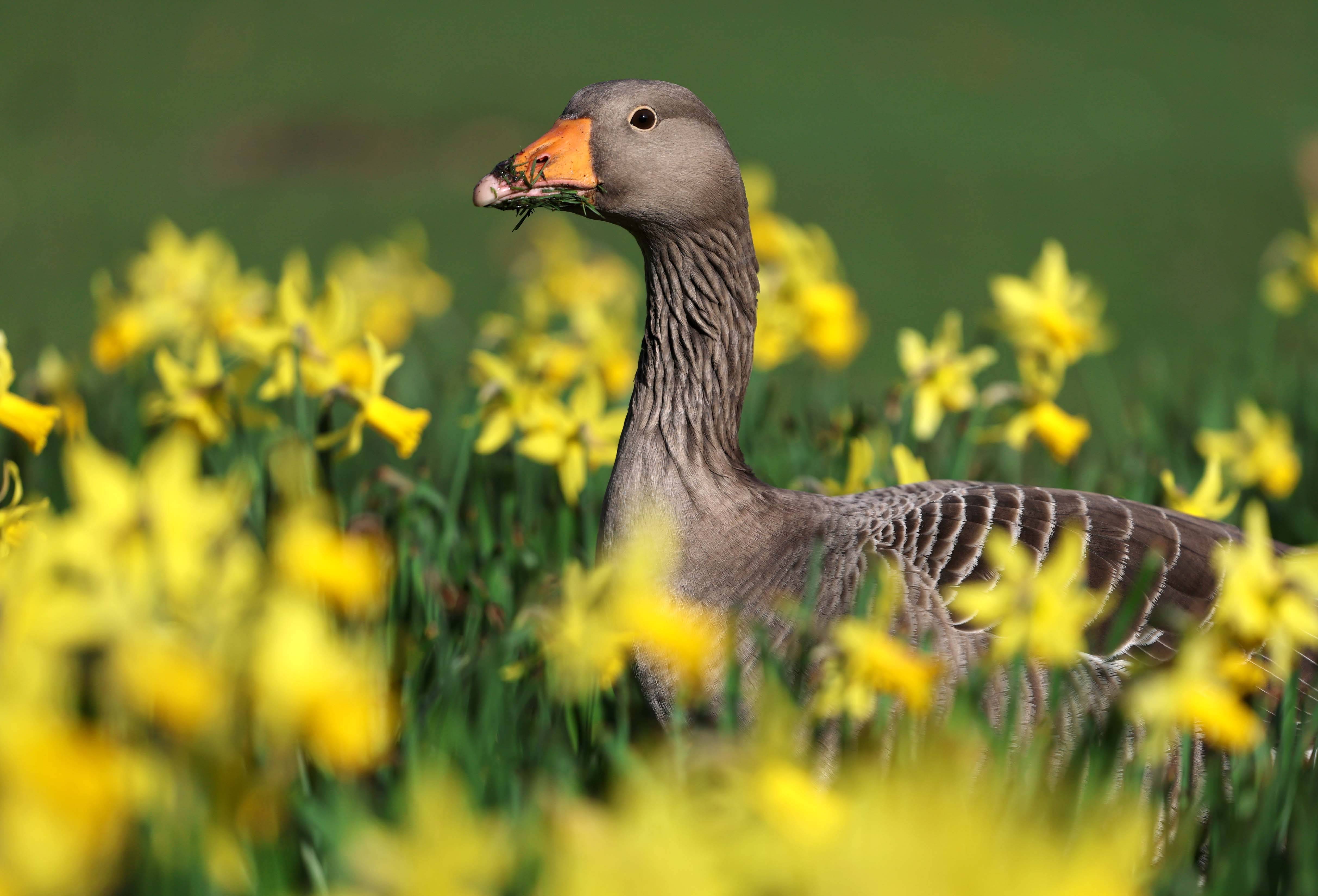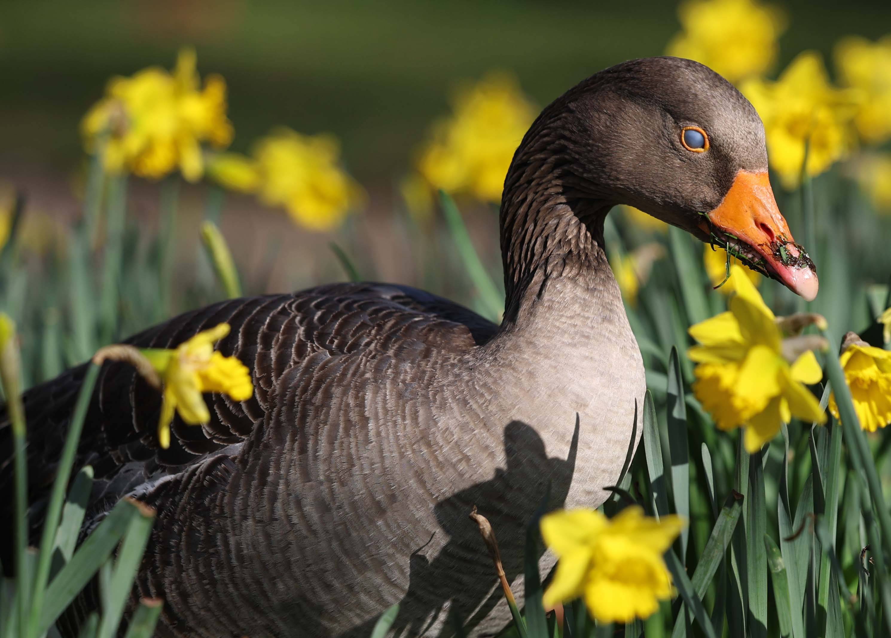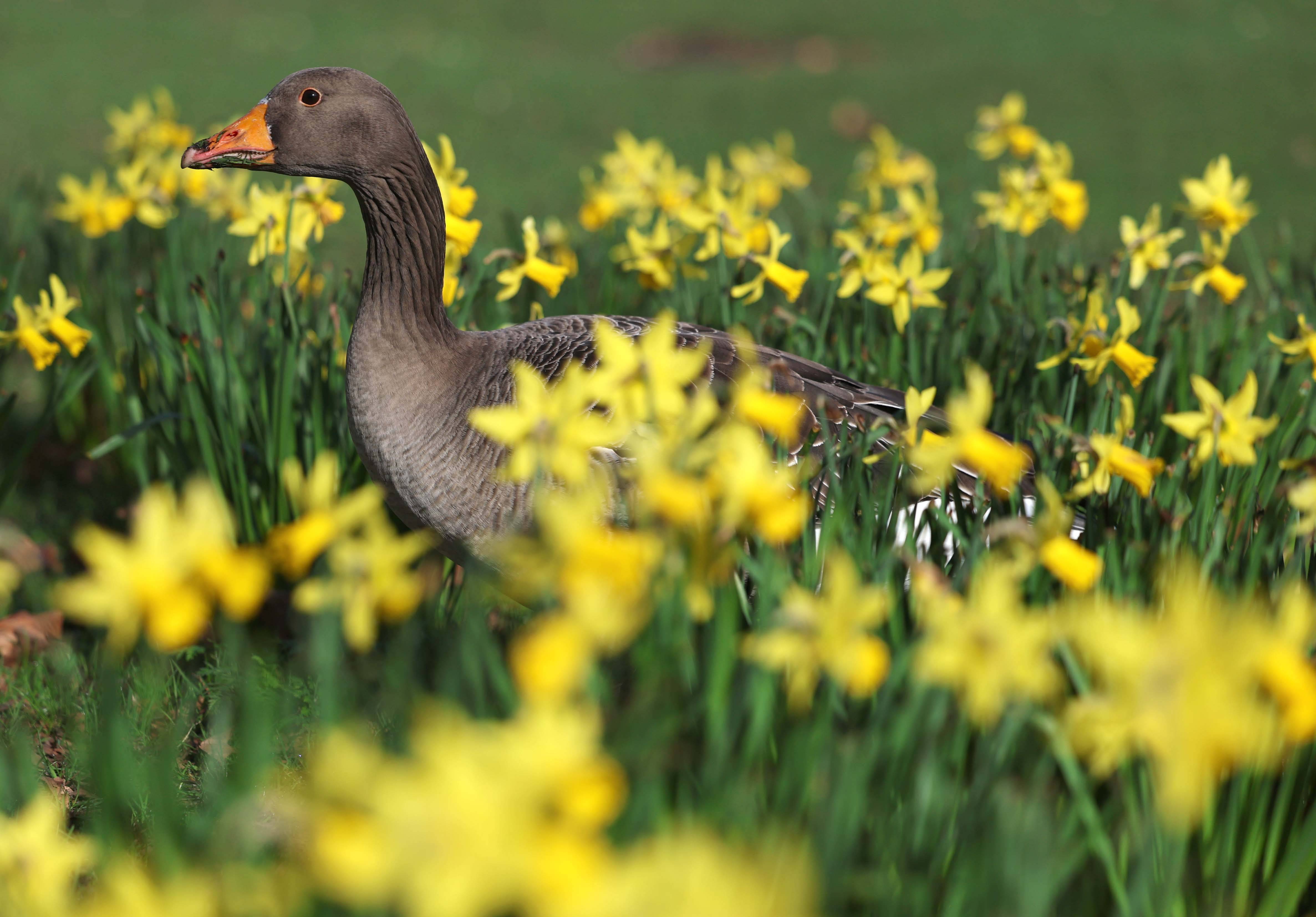 2月25日,一只鹅穿梭在英国伦敦圣詹姆斯公园的黄水仙花丛中。 新华社/欧新