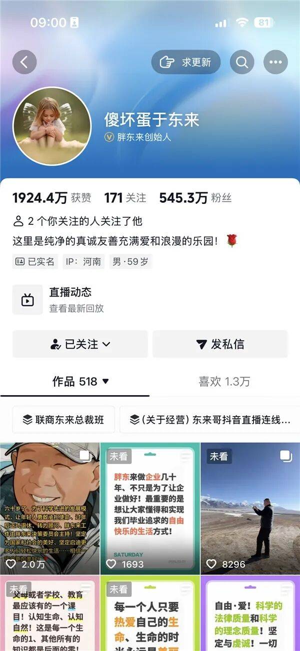 据正观新闻报道,于东来官宣退休后不久,个人账号昵称改为“傻坏蛋于东来”。于东来曾多次在公开场合自称“傻坏蛋”,因为自己年轻时候太调皮捣蛋。