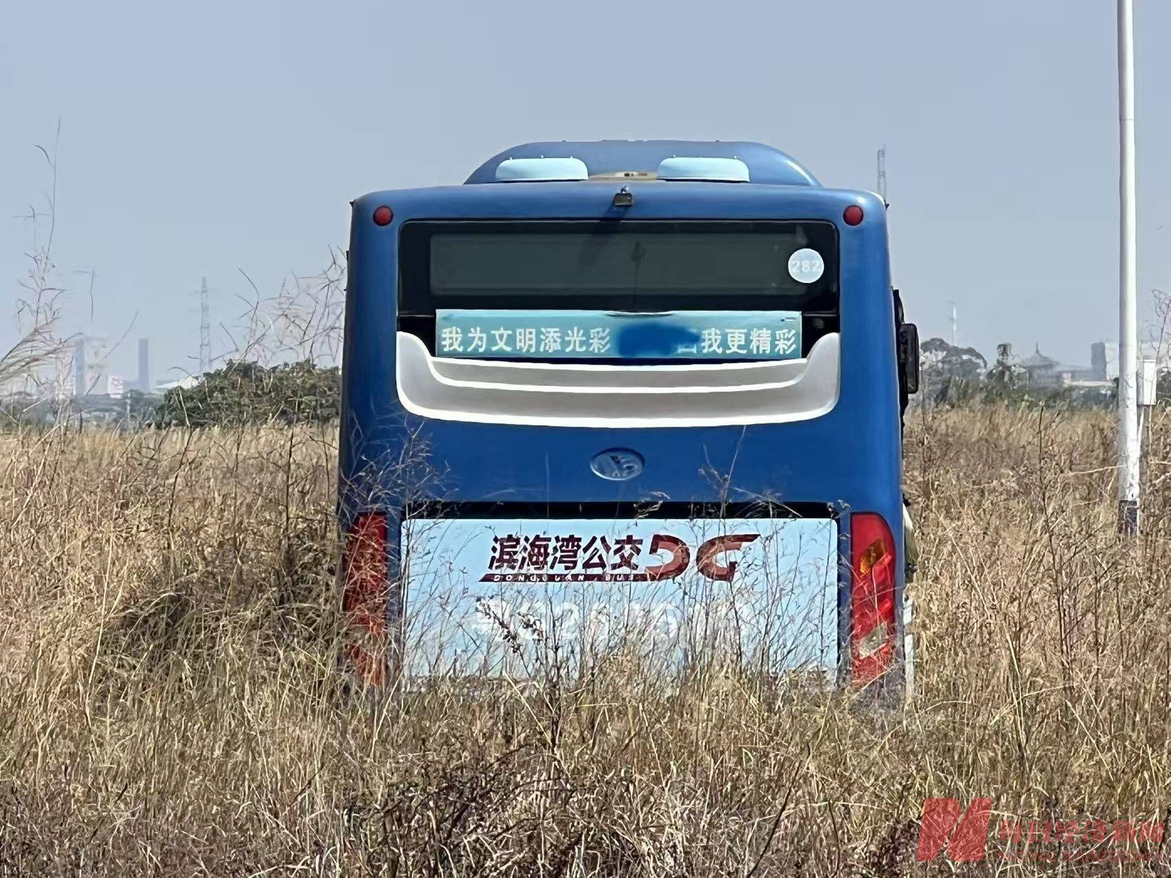 而在中汽宏远公司后方的空地上,还有标着“滨海湾公交”字样的电动公交车已停放多时,被埋没在杂草中。