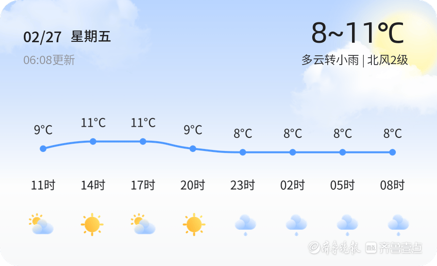 今天是2026年2月27日,星期五,农历正月十一。菏泽市的天气为多云转小雨,当前温度5.6℃,最高气温11℃,最低气温8℃。北风2级,湿度89%,空气质量为中度污染。今天的天气状况对市民的出行产生了一定影响,特别是降雨可能导致道路湿滑,建议市民出行时携带雨具,减速慢行,注意交通安全。空气质量方面,PM2.5指数为140,属于中度污染,建议敏感人群减少户外活动,必要时佩戴口罩。