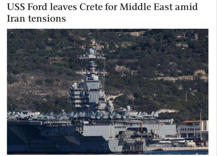 中新网2月27日电 据外媒报道,当地时间26日,美军最大航母“杰拉尔德·R·福特”号离开位于希腊南部克里特岛苏达湾的海军基地,前往中东。