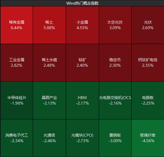 板块方面,钢铁、小金属、电力、能源设备、贵金属、化纤行业,石油化工、港口等概念涨幅居前;光模块、光通信、玻璃纤维、覆铜板、先进封装、半导体、建材等概念跌幅居前。