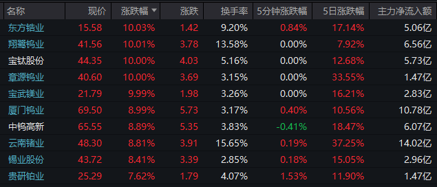 小金属概念继续大涨。翔鹭钨业、宝钛股份、章源钨业、宝武镁业涨停,中钨高新、云南锗业、锡业股份、厦门钨业、东方锆业等涨幅居前。