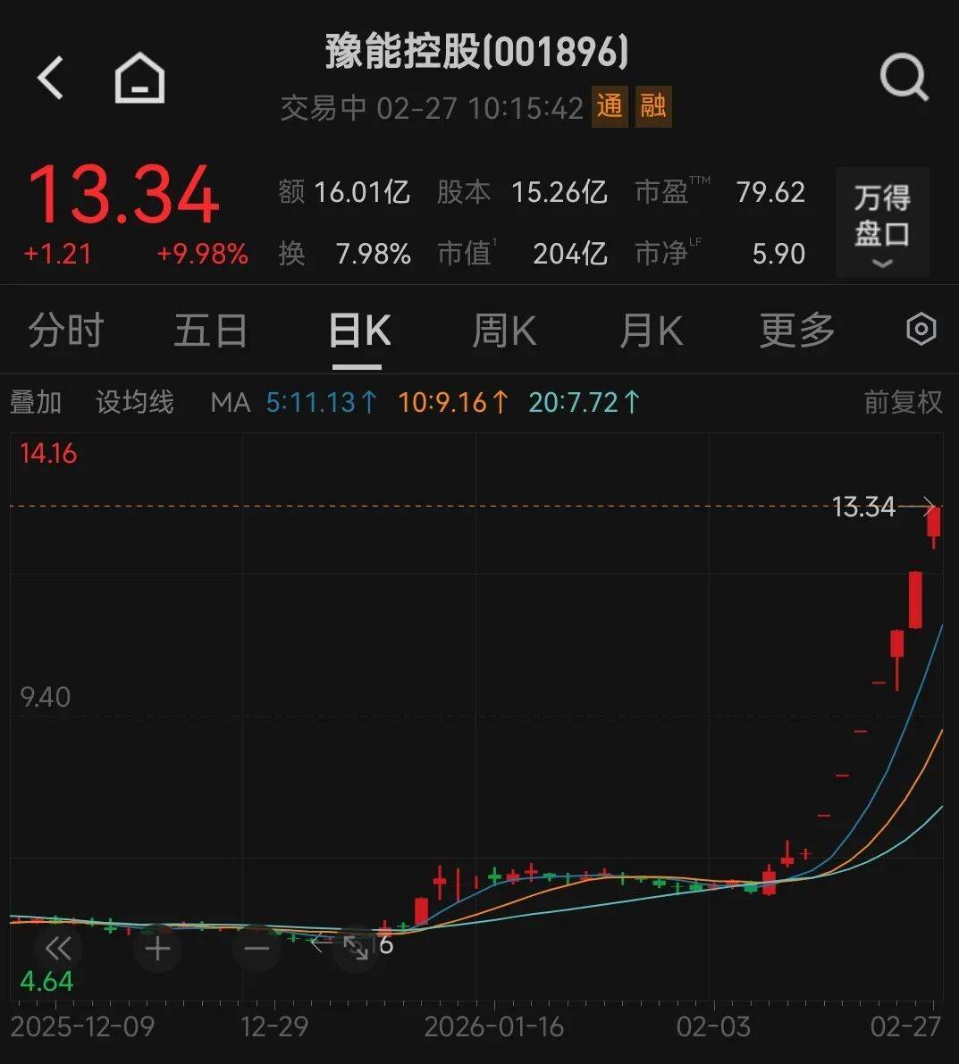热点方面,豫能控股7连板,最新股价13.34元,自2月10日该波上涨以来,股价已上涨一倍,最新市值超过200亿元。