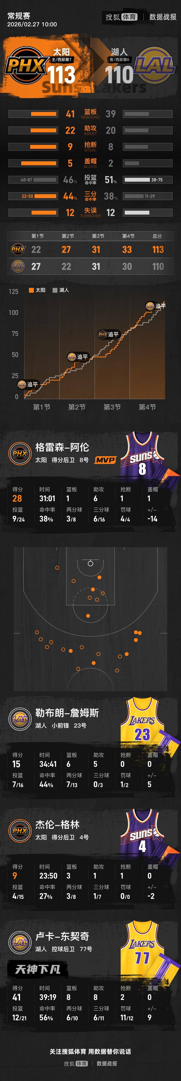 【搜狐体育战报】北京时间2月27日NBA常规赛,主场作战的太阳以113-110击败湖人,湖人遭遇3连败。阿伦28分1篮板6助攻,东契奇41分8篮板8助攻。
