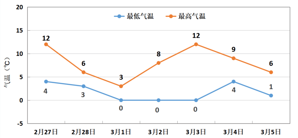 图2 2026年2月27日至3月5日郑州气温趋势图(单位:℃)