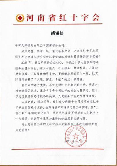 此次感谢信的送达,标志着中荷人寿河南省分公司在履行企业社会责任方面迈上了新的台阶。未来,中荷人寿河南省分公司将继续秉持“保险让生活更美好”的初心,深化与河南省红十字会等公益组织的合作,在应急救护培训、人道救助、健康促进等领域探索更多创新模式,同时将进一步完善公益体系,让更多员工、客户和合作伙伴参与到公益事业中来,用实际行动践行企业社会责任,为构建和谐社会贡献保险力量。