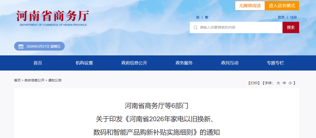 2月27日,河南省商务厅等6部门印发《河南省2026年家电以旧换新、数码和智能产品购新补贴实施细则》。