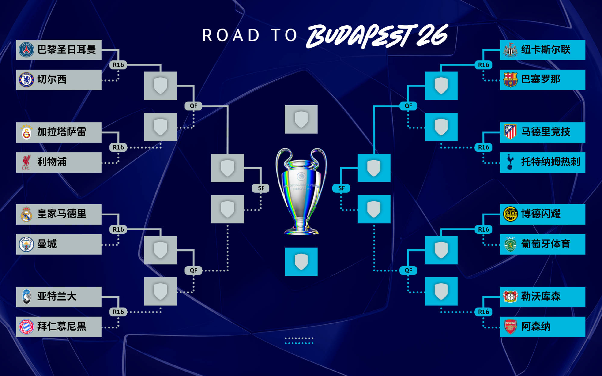 通过附加赛晋级欧冠16强的8队:马德里竞技、勒沃库森、纽卡斯尔联、博德闪耀、加拉塔萨雷、巴黎圣日耳曼、皇马、亚特兰大。