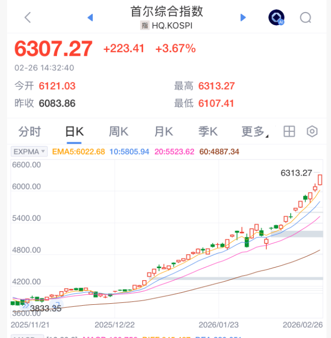 兄弟姐妹们啊,韩国股市涨疯了,2月26日,韩国股市收盘上涨超过3%,首次突破6300点大关。