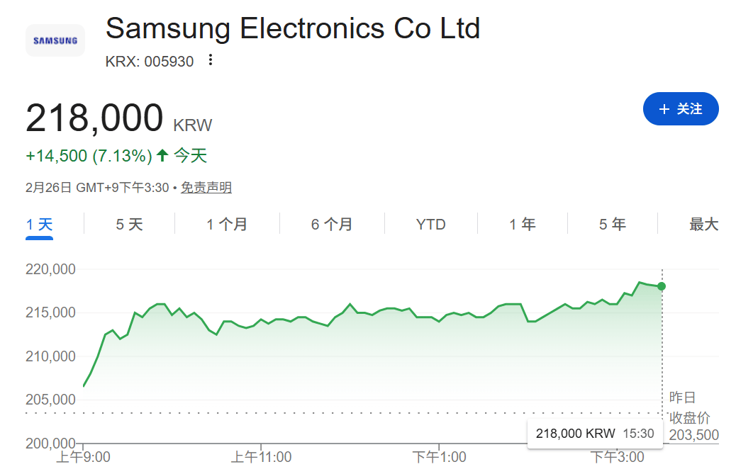 受英伟达业绩报告好于预期提振,投资者对人工智能前景充满信心,三星电子与SK海力士均暴涨超过7%,领涨指数。