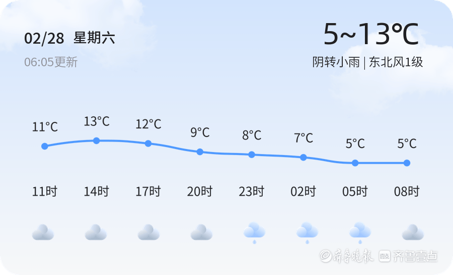 今天是2月28日,星期六,农历正月十二。泰安市今日天气以阴转小雨为主,气温在5℃至13℃之间,东北风1级,空气湿度为65%,PM2.5指数为132。各区县天气情况基本一致,市民出行需注意携带雨具,防范雨天路滑。