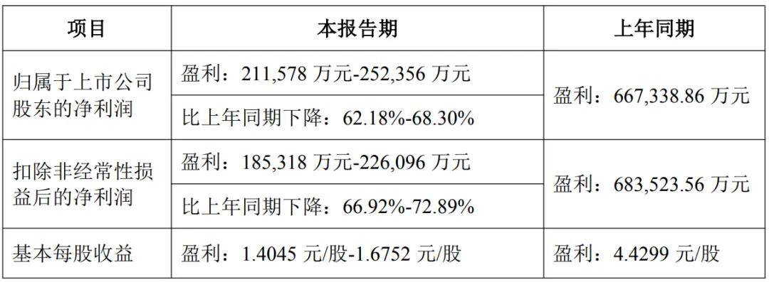 1月23日晚间,洋河发布了2025年业绩预告,根据预告,公司归属于上市公司股东的净利润为211,578万元-252,356万元,上年同期为667,338.86万元,比上年同期下降62.18%-68.30%;扣除非经常性损益后的净利润为185,318万元-226,096万元,上年同期为683,523.56万元,比上年同期下降66.92%-72.89%;基本每股收益1.4045元/股-1.6752元/股,上年同期盈利:4.4299 元/股。