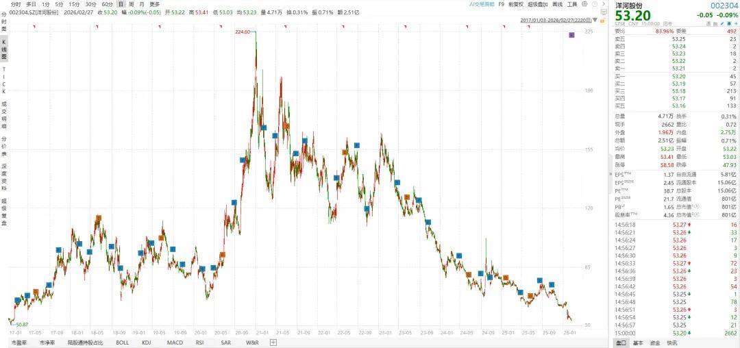 若论近几年最不如意的白酒股,洋河股份(002304)绝对可以算得上其中之一,2月最后一个交易日,洋河股价下跌0.09%,最低见53.03元,收于53.20元,前复权之后,这个价位,上一次还是发生在2017年。