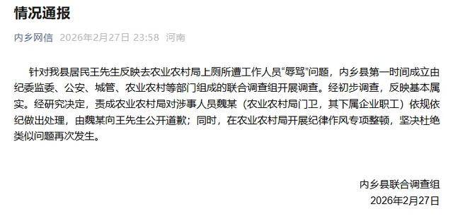 针对我县居民王先生反映去农业农村局上厕所遭工作人员“辱骂”问题,内乡县第一时间成立由纪委监委、公安、城管、农业农村等部门组成的联合调查组开展调查。经初步调查,反映基本属实。