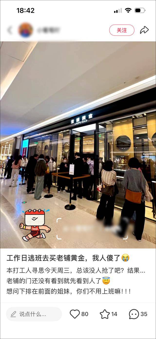 还有网友说,工作日逃班去老铺黄金,结果人傻了。“老铺的门还没看到,就先看到人,你们都不用上班嘛!”