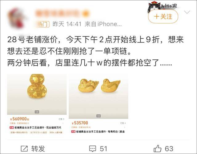 “下午2点开始线上9折,想来想去还是忍不住刚刚抢了一单项链。两分钟后看,店里连几十万的摆件都抢空了……”一位网友说。