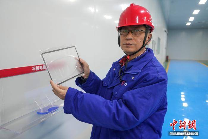 图为工作人员展示用于平板电脑的电子玻璃基板产品。张楠 摄