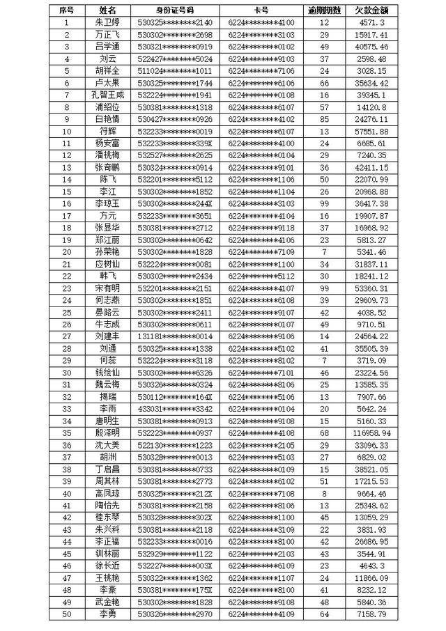 以下人员在曲靖市麒麟区农村信用合作联社办理贷记卡,截止2026年2月25日,已逾期4期(含)以上,具体欠款金额见下表,现予以公告催收。请以下人员自公告之日起15日内,向本社清偿下述逾期债务及公告之日起至实际清偿之日止的逾期债务。对拒不履行者,我社将依据有关规定,向公安机关报案或向人民法院提起诉讼。