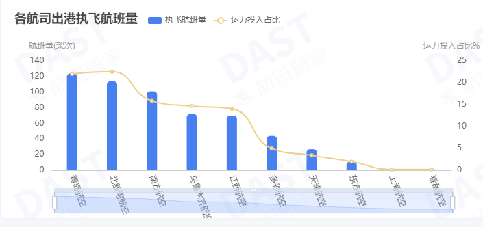 继续分析——航司运力投放决定了两座机场迥异的表现。上述数据显示,南阳暑运共提供座位25.5万个,洛阳只有18.3万个。两座机场航线条数相近,但南阳运力领先多达39%,说明其单航线密度更高、班次更密。