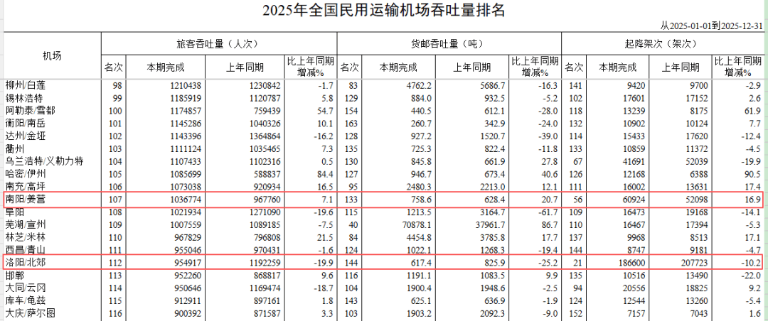数据显示,2025年,南阳机场客运量103.68万人次,同比增长7.1%,居全国第107位;洛阳机场客运量为95.49万人次,同比减少19.9%,全国排名从2024年的96位跌至112位。