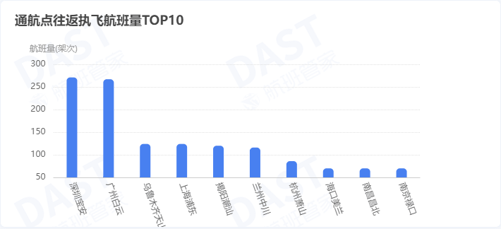 从通航点来看,南阳TOP10航点包括深圳、广州、乌鲁木齐、上海浦东、揭阳潮汕、兰州、杭州、海口、南昌、南京,其中前6个航点航班量均超过100个。