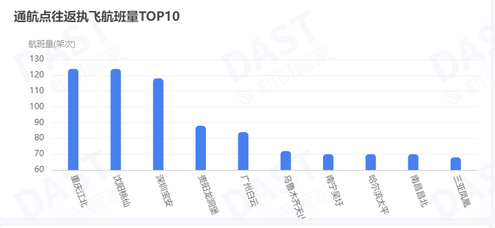 洛阳TOP10通航点分别为重庆、沈阳、深圳、贵阳、广州、乌鲁木齐、南宁、哈尔滨、南昌、三亚。但只有前三个航点航班量超过100个。