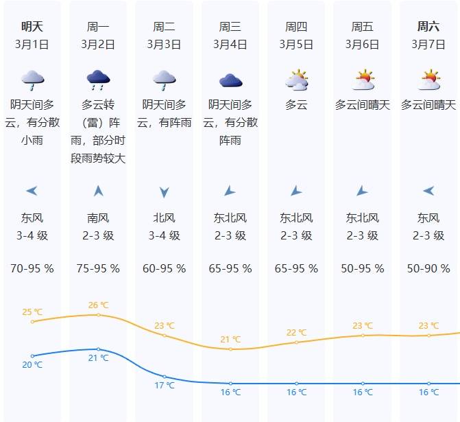3月1日阴天间多云,有分散小雨,气温20-25℃,沿海高地最大阵风6-7级;