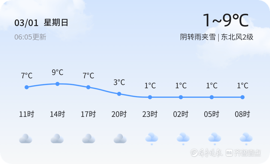 今天是2026年3月1日,星期日,农历正月十三。滨州的天气为阴转雨夹雪,温度在1℃至9℃之间,东北风2级,空气湿度为81%。PM2.5浓度为115微克/立方米,属于轻度污染。市民外出时请注意保暖和防滑,建议携带雨具,确保出行安全。今天的空气质量状况为轻度污染,建议敏感人群减少户外活动,必要时佩戴口罩。未来三天,滨州的天气将以阴雨夹雪为主,气温波动较大,市民需注意天气变化,及时增减衣物。其中,周三有雨夹雪天气,可能会对交通造成一定影响,提醒市民出行时减速慢行,注意交通安全。此外,周三的气温较低,市民需做好保暖措施,避免感冒。周三的雨夹雪天气可能会导致道路湿滑,建议市民尽量避免在恶劣天气下进行户外活动,确保自身安全。未来七天,滨州的天气总体以阴雨夹雪和多云为主,气温波动较大,市民需密切关注天气预报,合理安排出行计划。建议市民根据天气变化,适时增减衣物,注意保暖和防滑,