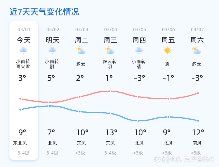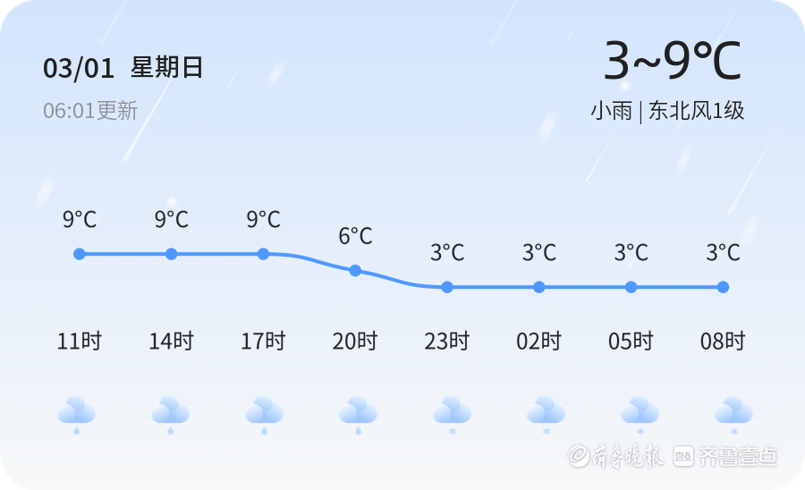 今天是3月1日,正月十三,淄博市迎来小雨天气。全市各区普遍出现小雨,气温在3℃到9℃之间,东北风1级,空气湿度较高,达到93%。目前,气温为2.3℃,PM2.5指数为129。提醒市民注意防寒保暖,出行携带雨具。