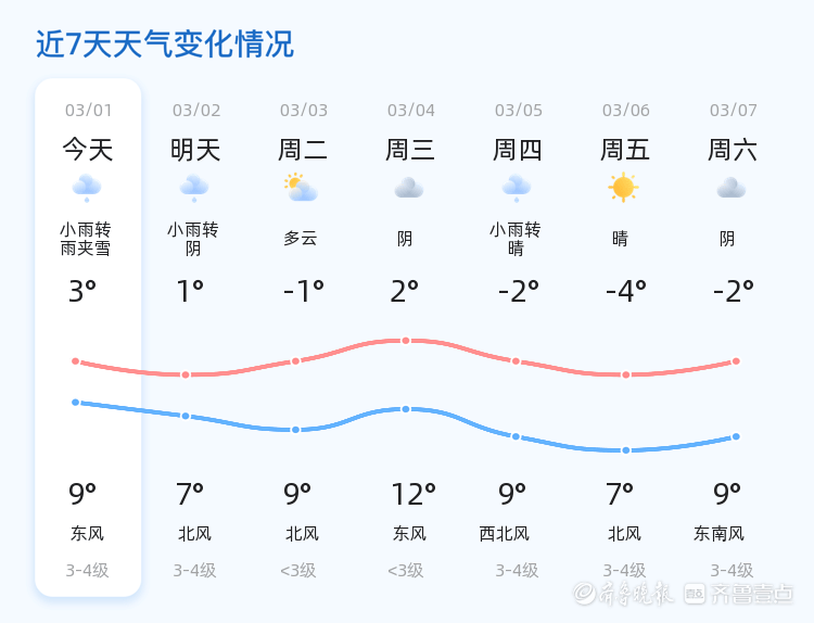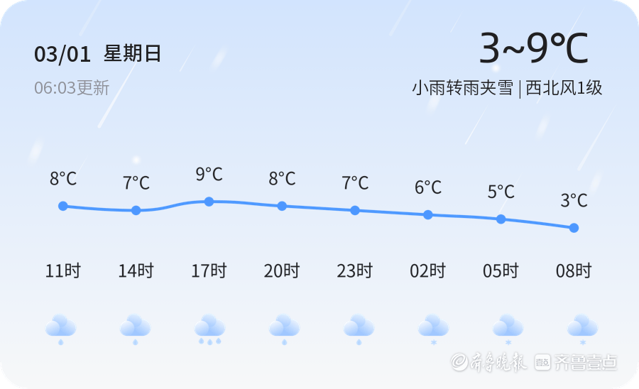 今天是3月1日,星期三,农历正月十三。潍坊市迎来小雨转雨夹雪的天气,气温在3℃到9℃之间,湿度高达91%,PM2.5指数为120,空气质量为轻度污染。全市各区均出现小雨转雨夹雪天气,部分地区降雨量较大,能见度较低。市民外出需携带雨具,注意交通安全。今天的风力为西北风1级,较为温和,但由于雨雪天气,路面湿滑,建议市民减速慢行,尤其是驾车出行时需格外小心。