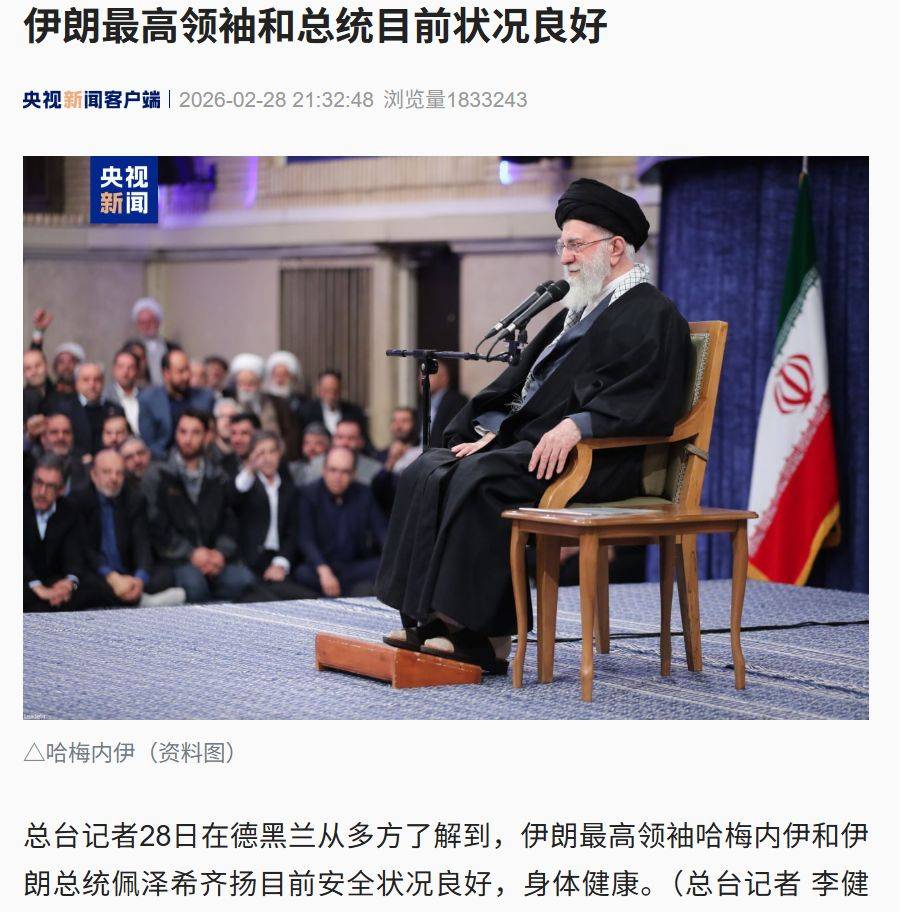 据央视新闻,总台记者28日在德黑兰从多方了解到,伊朗最高领袖哈梅内伊和伊朗总统佩泽希齐扬目前安全状况良好,身体健康。