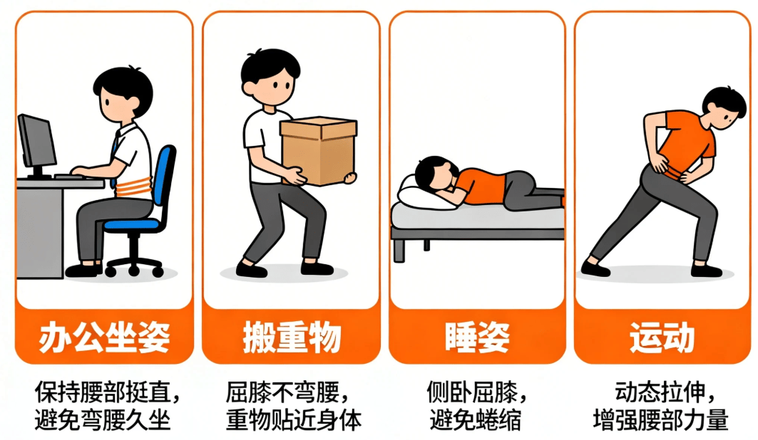 避免长期保持同一姿势,定时起身活动颈肩腰部,做简单拉伸;搬抬重物时屈膝下蹲、用腿发力,切勿弯腰直搬,防止腰伤;床垫选软硬适中款,睡眠以仰卧、侧卧为佳,枕头高度以贴合颈椎生理曲度为宜,不俯卧睡觉。