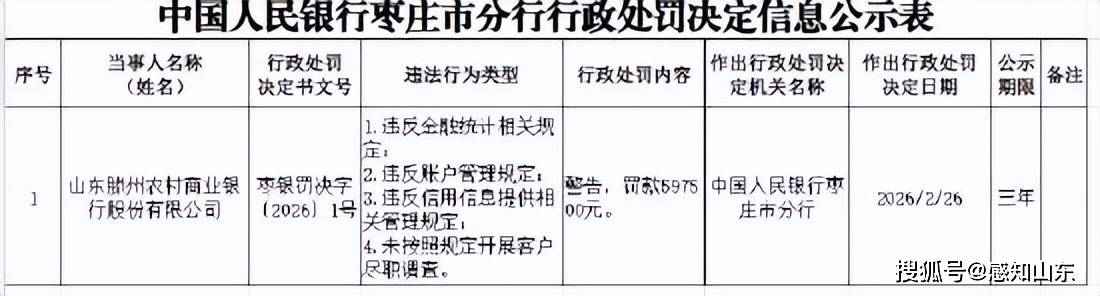 中国人民银行枣庄市分行行政处罚信息公开表显示,山东滕州农村商业银行股份有限公司因违反金融统计相关规定、违反账户管理规定、违反信用信息提供相关管理规定、未按照规定开展客户尽职调查,被警告并罚款59.75万元。