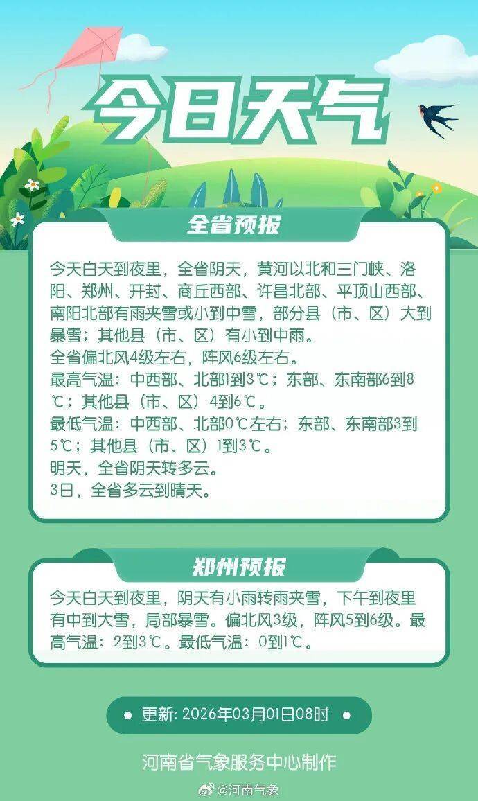 今天,随着气温下探,黄河以北及三门峡、洛阳、郑州等地的降水形态,将正式从雨转为雨夹雪或小到中雪,局部甚至有大到暴雪的量级。至于省内的其他区域,今天也将被中雨或局部大雨覆盖。