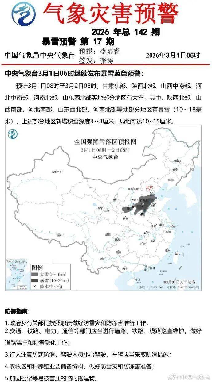 北方的雪又来了!中央气象台今天早上继续发布了暴雪预警,预计今天8时至明天8时,甘肃东部、陕西北部、山西中南部、河北中南部、河南北部、山东西北部等地部分地区有大雪,其中,陕西北部、山西南部、河北南部、山东西北部、河南北部等地部分地区有暴雪。