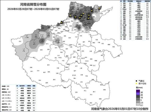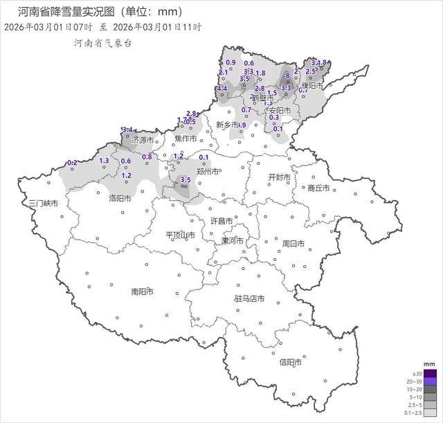 昨天全省出现小到中雨,北部、中西部出现中到大雪局部暴雪。截至1日5时,我省北部安阳、鹤壁等地部分县(市、区)有1到4厘米积雪。