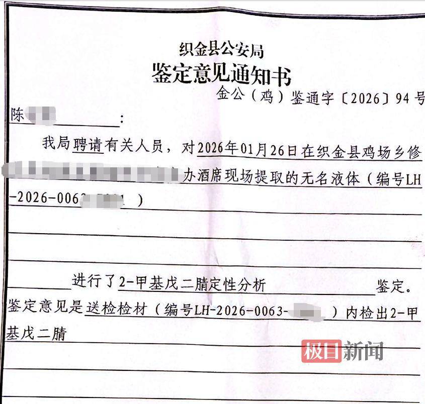 3月1日,鸡场乡因误饮燃料离世村民的儿子陈先生告诉极目新闻记者,他父亲1月26日前往邻居家吃喜宴,主家也是请了“一条龙”服务,燃料就摆放在餐桌附近,父亲误将其当成白酒饮用,随后身体不适被送医,于1月27日抢救无效去世。陈先生提供的织金县公安局鉴定意见书显示,在其父亲误饮的液体中,也检测出了2-甲基戊二腈。