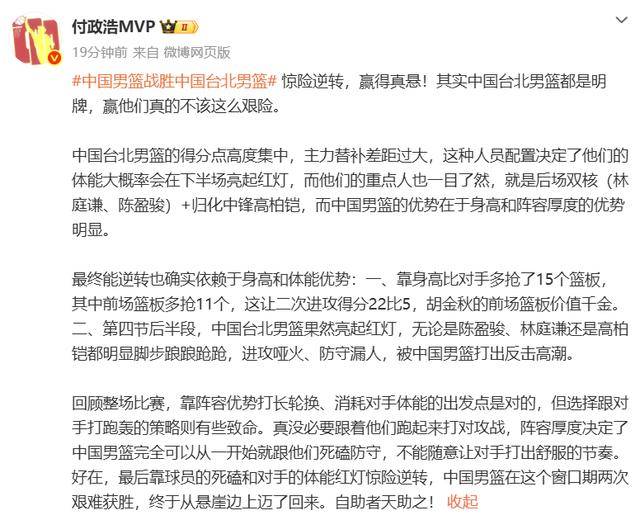 相比于前两位的战术分析,资深体育媒体人付政浩的评论则更具宏观视角的批判性。他一针见血地指出,中国台北男篮的牌面几乎是明牌,核心得分点高度集中在陈盈骏、林庭谦和归化球员高柏铠三人身上,且主力与替补之间存在巨大的实力鸿沟,体能问题几乎是他们注定的死穴。