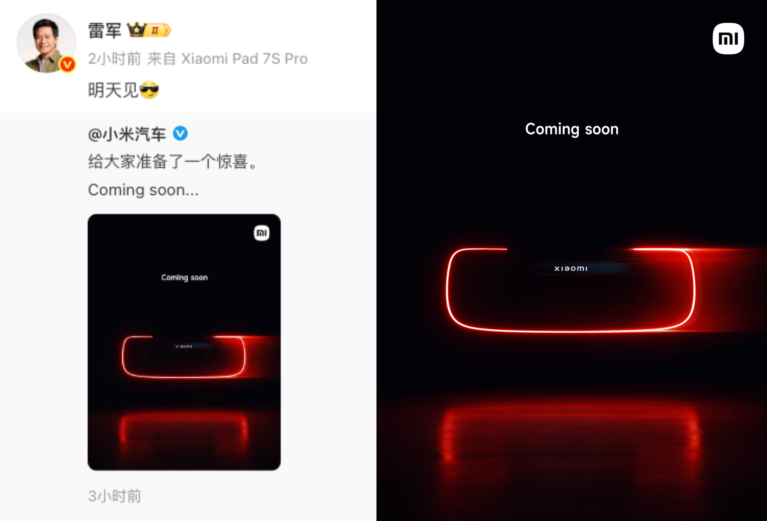 今天(2月28日)早上,小米汽车突然官宣新车Coming soon,雷军更在下方留言「明天见」,瞬间引发热议。