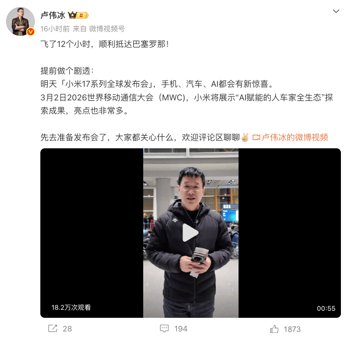 为什么是在巴塞罗那?小米集团卢伟冰同样在今日官宣:小米将会参展3月2日举办的2026世界移动通信大会(MWC),并表示手机、汽车、AI三大领域均有重磅惊喜。