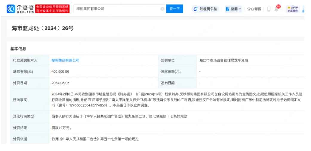 2024年5月6日,椰树集团有限公司因使用国家机关工作人员进行商业营销,并使用“用椰子擦乳”“南太平洋美女很少‘飞机场’”等广告语,被海口市市场监管局龙华分局罚款40万元,海口市市场监管局认为,广告含有妨碍社会公共秩序和违背社会良好风尚的内容和情形。