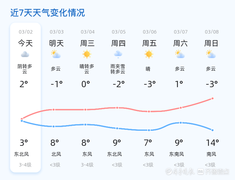 今天是3月2日,星期一,农历正月十四。滨州地区今天以阴转多云天气为主,气温较为平稳,白天气温最高为3℃,最低气温为2℃。北风2级,空气湿度较高,达到97%,PM2.5指数为142,建议市民外出时做好防护措施。