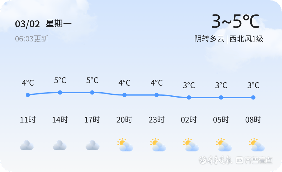 今天是3月2日,星期一,农历正月十四。潍坊市今日天气为阴转多云,气温较为适宜,全市各区的最高气温为5℃,最低气温为3℃。目前实时温度为0.9℃,风力较小,西北风1级,空气湿度高达99%,PM2.5指数为131,空气质量处于轻度污染水平。市民出行时建议佩戴口罩,做好防护措施。