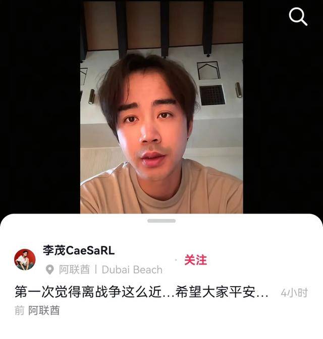 3月1日上午,前“至上励合”组合成员、演员李茂发布视频称,“第一次离战争这么近”,他讲述在迪拜遭遇航班取消无法回国的情况,并祈愿当地同胞平安。