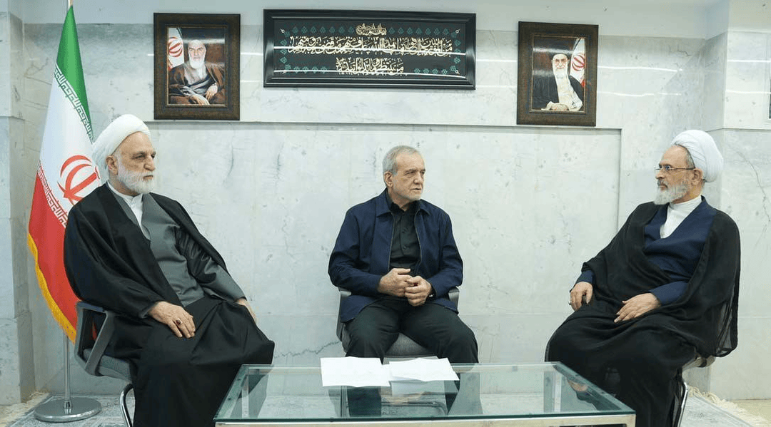 伊朗总统佩泽希齐扬、伊朗司法总监埃杰耶、宪法监护委员会成员、专家会议副主席及伊朗全国神学院院长阿拉菲出席伊朗临时领导委员会第二次正式会议。