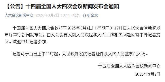 十四届全国人大四次会议将于2026年3月4日(星期三)12时在人民大会堂新闻发布厅举行新闻发布会,由大会发言人就大会议程和人大工作相关问题回答中外记者提问。欢迎中外记者参加。