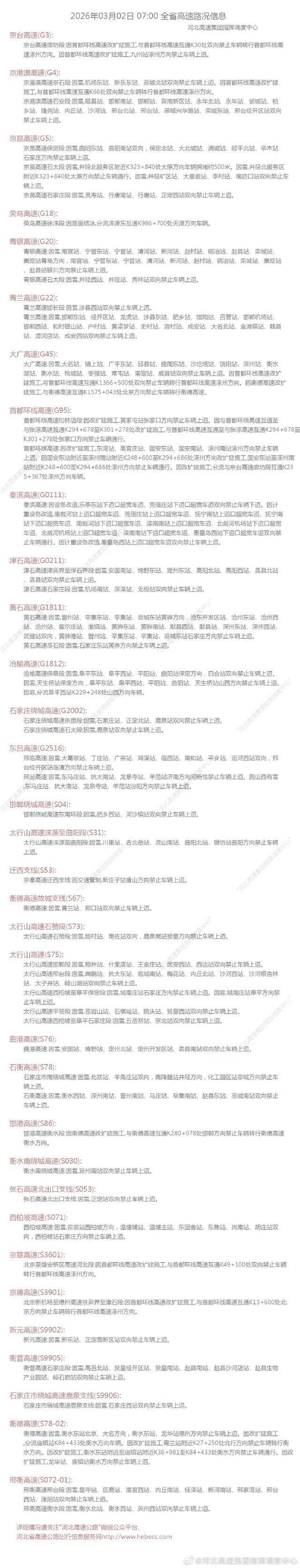 据河北交警微发布最新消息,因雪,河北多条高速站口关闭,有出行计划的小伙伴请注意,及时规划出行路线。