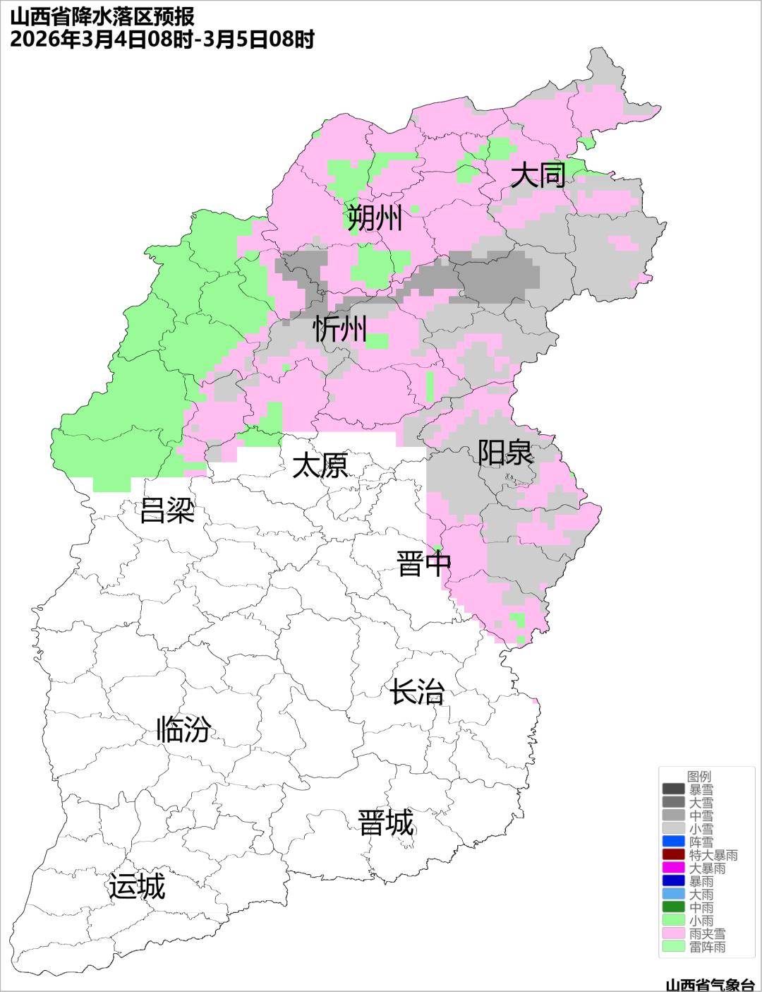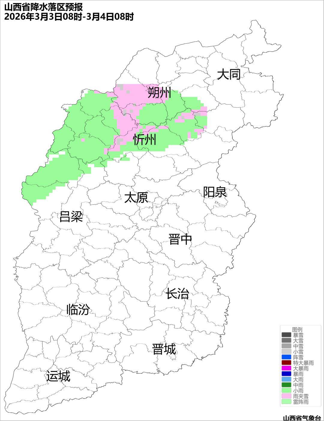 3月1日07时至2日07时,太原、长治、晋城和运城的全域,阳泉、晋中、忻州、临汾和吕梁的大部,大同的局部共100个县(市、区)出现降水,降水量介于0.1~26.1毫米之间,前3位出现在:长治(26.1)、乡宁台头峰岭(25.0)、尧都陈埝(23.8)。其中,上党区、乡宁、尧都区、屯留区、壶关、长子、安泽、潞州区、沁水、陵川、平顺、高平、潞城区、泽州共14个县(市、区)在19.9毫米以上,吉县、阳城、襄汾、洪洞、古县、蒲县、浮山、晋城城区、武乡、曲沃等36个县(市、区)在9.9~19.9毫米之间,介休、灵石、盂县、霍州、盐湖区、新绛、和顺、夏县、左权、交城等37个县(市、区)在4.9~9.9毫米之间,娄烦、离石区、临县、宁武、灵丘、兴县、方山、岢岚共8个县(市、区)在2.4~4.9毫米之间,代县、保德、繁峙、五寨、神池共5个县(市、区)在0.1~2.4毫米之间。
