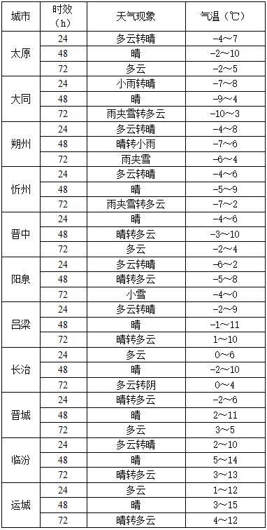 今天下午到夜间:全省阴天转多云,北部局部地区有雨夹雪或小雨。最高气温:全省1~12℃;最低气温:北中部及南部山区-9~-3℃,南部其余地区-2~2℃。